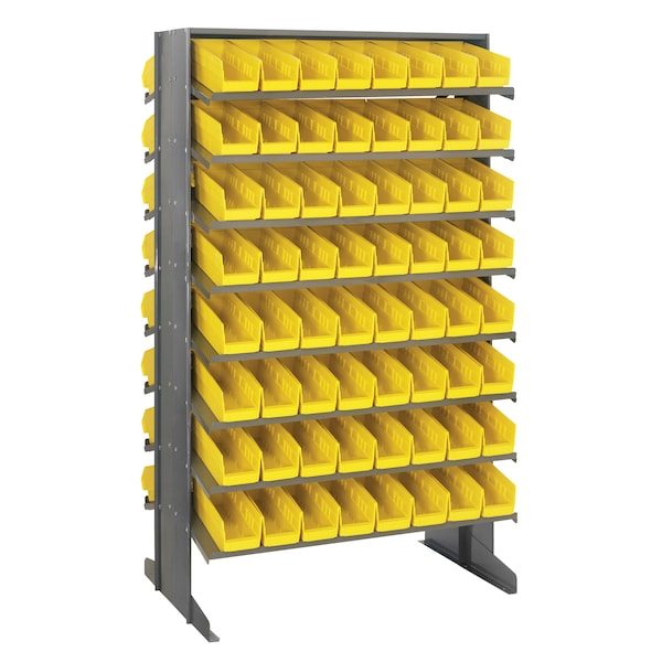 Pick Racks provide a convenient high density, easy access, sloped shelving system, available as bench units, single and double sided free standing and mobile units. Unit comes complete with Economical Shelf Bins. Sloped shelving unit keeps small and medium sized parts easily accessible. Open hopper front bins with label area, provide fast access to stored items. This all-in-one unit is easy to clean and will not rust or corrode. Bins are available in: Blue, Green, Ivory, Red, Yellow, Black and Clear. One bin color per unit.
