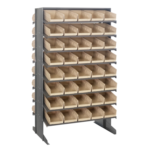 Pick Racks provide a convenient high density, easy access, sloped shelving system, available as bench units, single and double sided free standing and mobile units. Unit comes complete with Economical Shelf Bins. Sloped shelving unit keeps small and medium sized parts easily accessible. Open hopper front bins with label area, provide fast access to stored items. This all-in-one unit is easy to clean and will not rust or corrode. Bins are available in: Blue, Green, Ivory, Red, Yellow, Black and Clear. One bin color per unit.