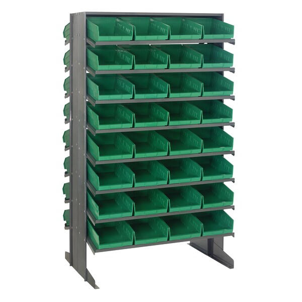 Pick Racks provide a convenient high density, easy access, sloped shelving system, available as bench units, single and double sided free standing and mobile units. Unit comes complete with Economical Shelf Bins. Sloped shelving unit keeps small and medium sized parts easily accessible. Open hopper front bins with label area, provide fast access to stored items. This all-in-one unit is easy to clean and will not rust or corrode. Bins are available in: Blue, Green, Ivory, Red, Yellow, Black and Clear. One bin color per unit.