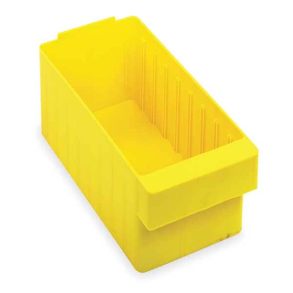 Drawer Bin, Color Yellow, Material Plastic, Overall Height 4 5/8 in, Overall Length 17 3/4 in, Overall Width 5 5/8 in, Stackable Not Stacking Capable, Weight Capacity 25 lb, Volume Capacity 0.26 cu ft, Divider Adjustment Increments Not Applicable, Includes Dividers Dividers Not Included, Inside Height 4 3/8 in, Inside Length 16 1/2 in, Inside Width 5 1/8 in, Number of Dividers 0, Resistant To Chemical, Oil