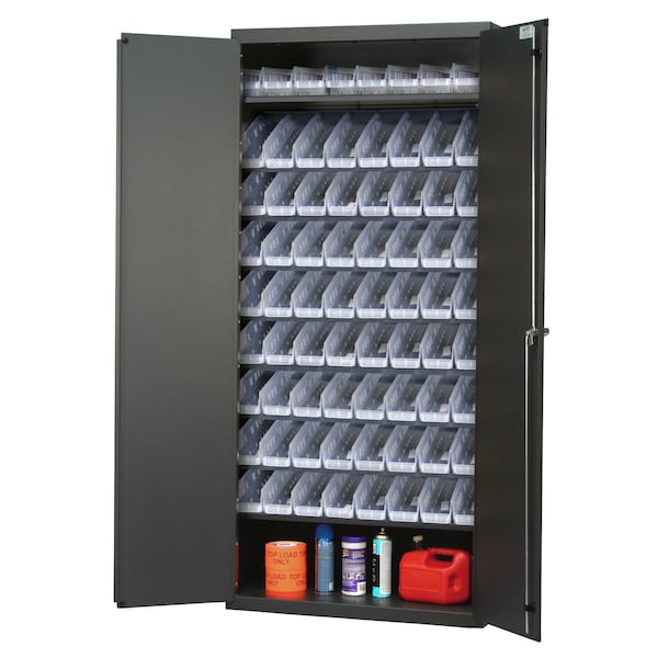 Heavy-Duty 36'' Bin Cabinet, 36''W x 18''D x 78''H, 400 lb. capacity per shelf, 14 gauge all welded construction, includes: 8 slopped shelves and 72 QSB101 clear bins, gray powder-coated finish