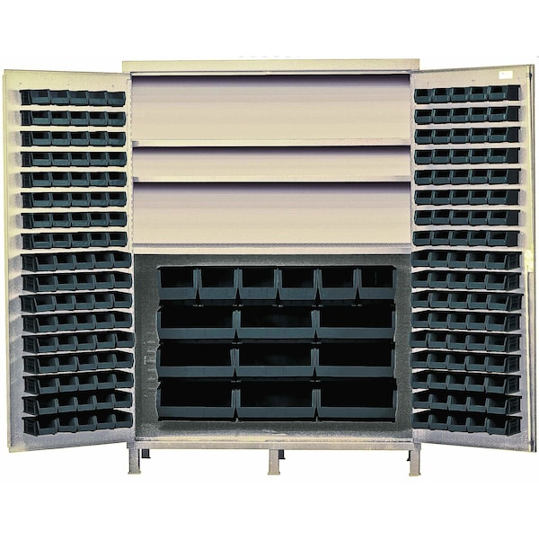Heavy-Duty 60'' Bin Cabinet, 60''W x 24''D x 84''H, 500 lb. capacity per interior shelf, 14 gauge all welded construction, includes: 3 adjustable shelves, 80 QUS210, 90 QUS220, 6 QUS240 and 9 QUS250 black bins, beige powder-coated finish