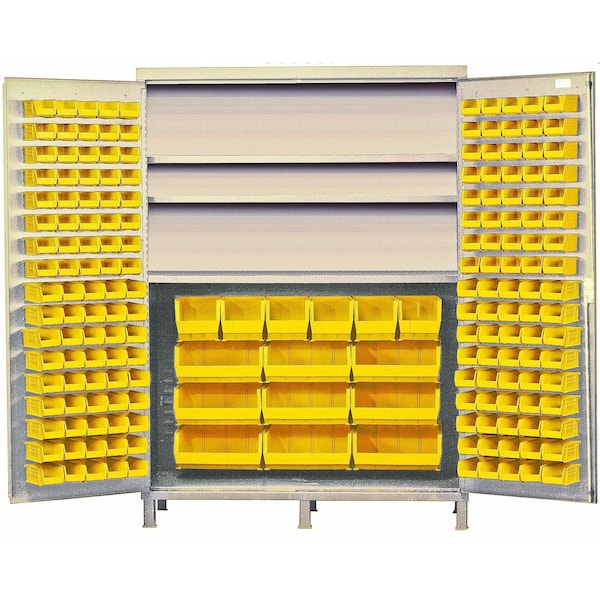 Heavy-Duty 72'' Bin Cabinet, 72''W x 24''D x 84''H, 500 lb. capacity per interior shelf, 14 gauge all welded construction, includes: 3 adjustable shelves, 96 QUS210, 96 QUS220, 8 QUS240 and 12 QUS250 yellow bins, beige powder-coated finish