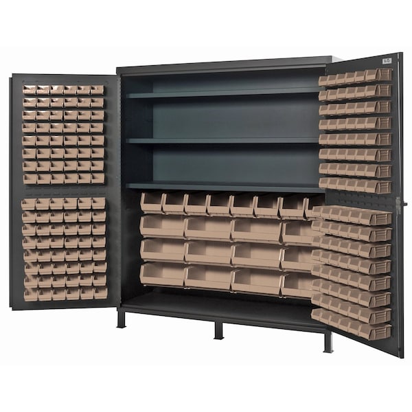 Heavy-Duty 72'' Bin Cabinet, 72''W x 24''D x 84''H, 500 lb. capacity per interior shelf, 14 gauge all welded construction, includes: 3 adjustable shelves, 96 QUS210, 96 QUS220, 8 QUS240 and 12 QUS250 clear bins, gray powder-coated finish