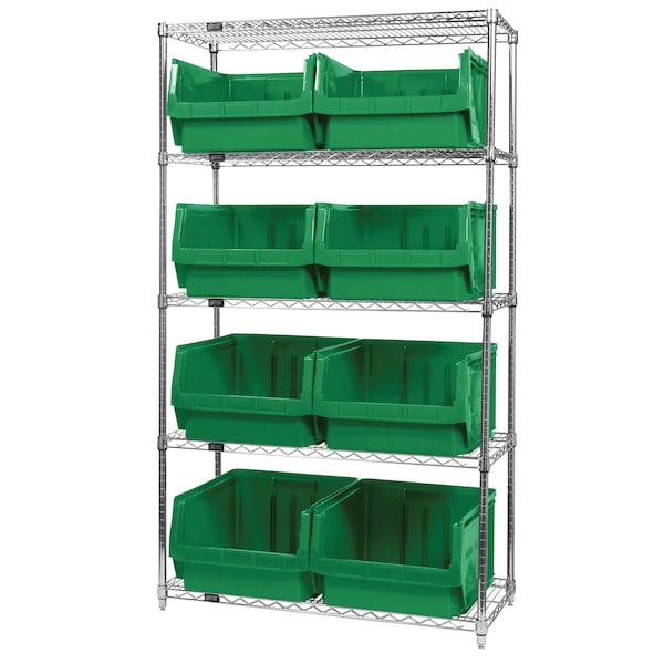 Comes complete with 5 shelves and 8 QMS543 Magnum bins. 800 lb. shelf capacity, bins have wide open hopper fronts for easy product access. Chrome wire shelving unit is strong and will provide long service life, bins available in red, black, green, black, blue and yellow. Ideal for storing a variety of items in industrial applications. Unit can be made mobile with use of WR-00H kit (available separately), unit allows air circulation, bins will not rust or corrode and are waterproof.
