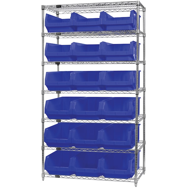 Comes complete with 7 shelves and 18 QMS532 Magnum bins. 800 lb. shelf capacity, bins have wide open hopper fronts for easy product access. Chrome wire shelving unit is strong and will provide long service life, bins available in red, black, green, black, blue and yellow. Ideal for storing a variety of items in industrial applications. Unit can be made mobile with use of WR-00H kit (available separately), unit allows air circulation, bins will not rust or corrode and are waterproof.