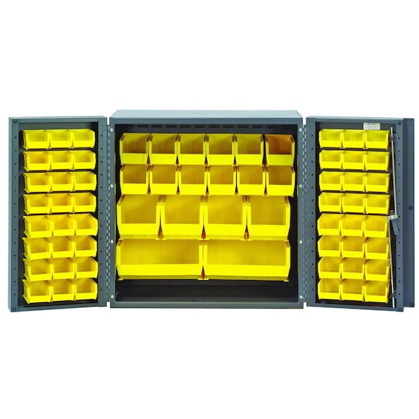 Heavy-Duty 36'' Bin Cabinet, 36''W x 24''D x 36''H, 14 gauge all welded construction, includes: 24 QUS210, 24 QUS220, 12 QUS230, 4 QUS240 and 2 QUS250 yellow bins, gray powder-coated finish