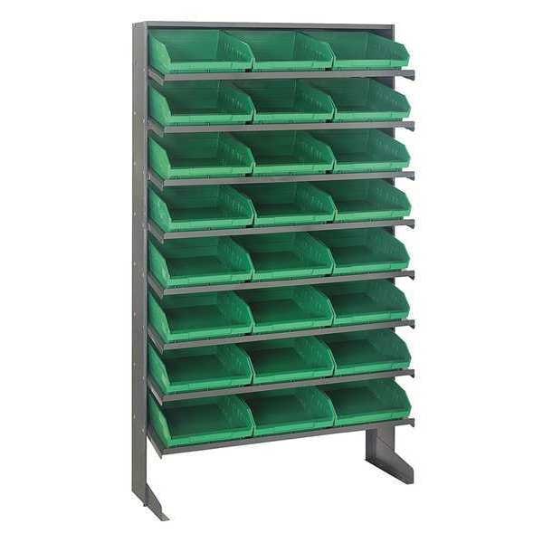 Pick Rack, Bin Style Shelf, Bin Material Polypropylene, (24) 4 in x 11 1/8 in x 11 5/8 in Bin HxWxD, Bin Height 4 in, Bin Front Type Open, Bin Depth 11 5/8 in, Bin Color Green, Frame Material Steel, Frame Color Gray, Powder Coated, Includes Bins Yes, Bin Width 11 1/8 in, Load Capacity per Shelf 50 lb, Number of Bins 24, Number of Shelves 8, Number of Usable Sides 1, Overall Depth 12 in, Overall Height 60 in, Overall Width 36 in, Powder Coated Shelf Finish, Steel Shelf Material, No