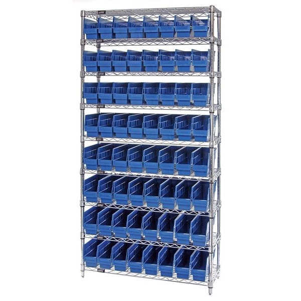 Bin Shelving, Bin Style Shelf, Bin Material Polypropylene, (64) 6 in x 4 1/8 in x 11 5/8 in Bin HxWxD, Bin Height 6 in, Bin Front Type Open, Bin Depth 11 5/8 in, Bin Color Blue, Frame Material Steel, NSF, Frame Color Silver, Chrome, Includes Bins Yes, Bin Width 4 1/8 in, Includes QSB201BL, Load Capacity per Shelf 800 lb, Number of Bins 64, Number of Shelves 9, Number of Usable Sides 1, Overall Depth 12 in, Overall Height 74 in, Overall Width 36 in, Chrome Shelf Finish, Steel Shelf Material, No