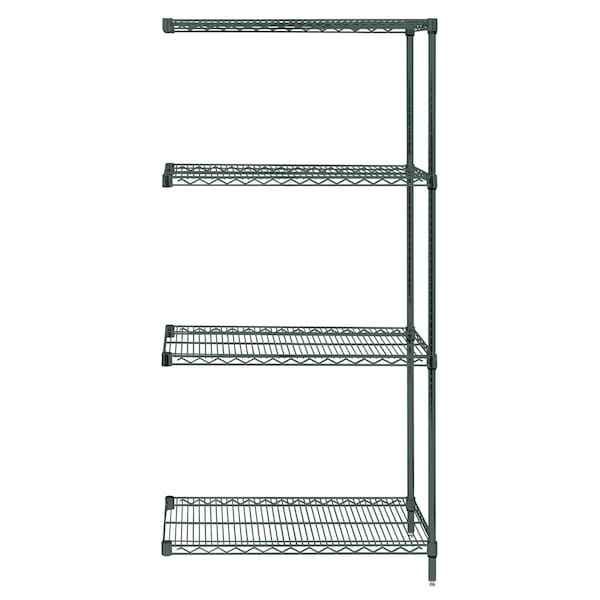 Wire Shelving Add-On Kit, 30''W x 18''D x 74''H, 600 - 800 lb. capacity, includes 4 wire shelves, 2 posts and 8 S-Hooks, green epoxy antimicrobial finish, NSF, shipped KD