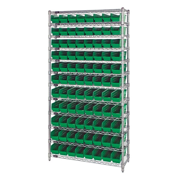 Complete bin systems are available with 4 different size bins on a 12”W x 36”L x 36”H unit. This all-purpose bin center is an economical high density storage system that provides easy visibility to stored contents. Easy boltless assembly, wire allows air to circulate as well as provides ideal product visibility, durable chrome finish endures years of heavy-duty dependability and service. Bins are available in 4 colors: Blue, Green, Ivory, Red, Yellow, Black and Clear.