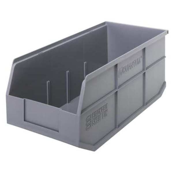 Shelf Bin, Color Gray, Includes Dividers Dividers Not Included, Includes Label Holder Label Holder Included, Material Plastic, Maximum Operating Temperature 250 Degrees F, Overall Height 7 in, Overall Length 18 in, Overall Width 8 1/4 in, Stackable Stacking Capable, Weight Capacity 70 lb, Mobility Stationary, Nestable Not Nesting Capable, Number of Divider Slots 3, Number of Long Divider Slots 0, Number of Short Divider Slots 3, Number of Dividers Not Applicable