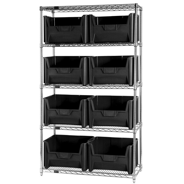 Shelving Unit, Bin Style Giant Stack, 12 7/16 x 19 7/8 x 15 1/4 in Bin HxWxD, Bin Height 12 7/16 in, Bin Front Type Open, Bin Depth 15 1/4 in, Bin Color Black, Frame Material Carbon Steel, Frame Color Chrome, Chrome, Includes Bins Yes, Bin Width 19 7/8 in, Includes (5) Shelves, (8) QGH700 Bins, Load Capacity per Shelf 800 lb, Mobility Mobile, Number of Bins 8, Number of Shelves 5, Number of Usable Sides 1, Overall Depth 42 in, Overall Height 74 in, Overall Width 18 in, Chrome Shelf Finish, N