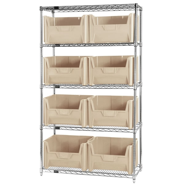 Shelving Unit, Bin Style Giant Stack, 12 7/16 x 19 7/8 x 15 1/4 in Bin HxWxD, Bin Height 12 7/16 in, Bin Front Type Open, Bin Depth 15 1/4 in, Bin Color White, Frame Material Carbon Steel, Frame Color Chrome, Chrome, Includes Bins Yes, Bin Width 19 7/8 in, Includes (5) Shelves, (8) QGH700 Bins, Load Capacity per Shelf 800 lb, Mobility Mobile, Number of Bins 8, Number of Shelves 5, Number of Usable Sides 1, Overall Depth 42 in, Overall Height 74 in, Overall Width 18 in, Chrome Shelf Finish, N