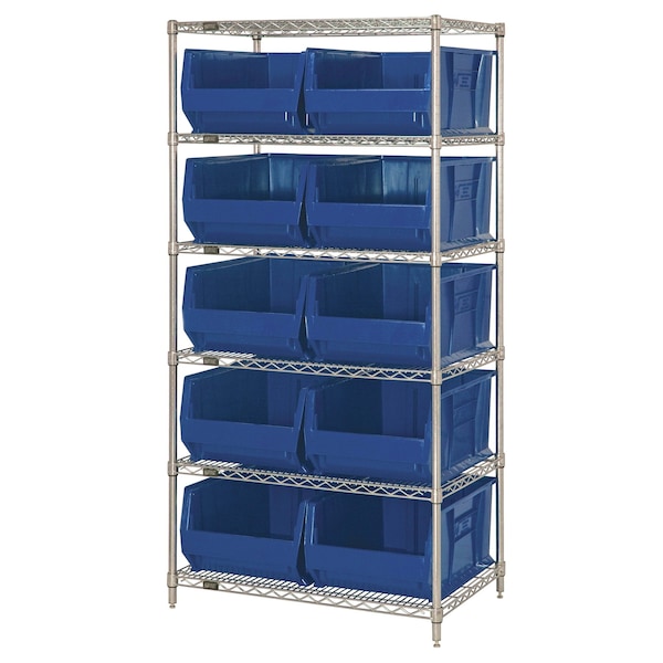 Shelving Unit, Bin Style Shelf, 11 x 16 1/2 x 23 7/8 in Bin HxWxD, Bin Height 11 in, Bin Depth 23 7/8 in, Bin Color Blue, Frame Material Carbon Steel, Frame Color Chrome, Chrome, Includes Bins Yes, Bin Width 16 1/2 in, Includes (6) Shelves, QUS957 Extra-Large Bins, Load Capacity per Shelf 800 lb, Number of Bins 10, Number of Shelves 6, Number of Usable Sides 1, Overall Depth 48 in, Overall Height 74 in, Overall Width 24 in, Chrome Shelf Finish, N, Whole Unit Load Capacity 800 lb