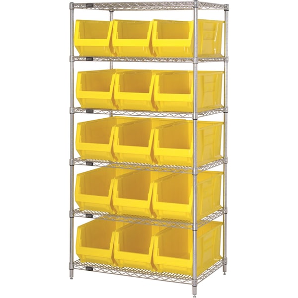 Shelving Unit, Bin Style Shelf, 11 x 16 1/2 x 23 7/8 in Bin HxWxD, Bin Height 11 in, Bin Depth 23 7/8 in, Bin Color Yellow, Frame Material Carbon Steel, Frame Color Chrome, Chrome, Includes Bins Yes, Bin Width 16 1/2 in, Includes (6) Shelves, QUS957 Extra-Large Bins, Load Capacity per Shelf 800 lb, Number of Bins 10, Number of Shelves 6, Number of Usable Sides 1, Overall Depth 48 in, Overall Height 74 in, Overall Width 24 in, Chrome Shelf Finish, N, Whole Unit Load Capacity 800 lb