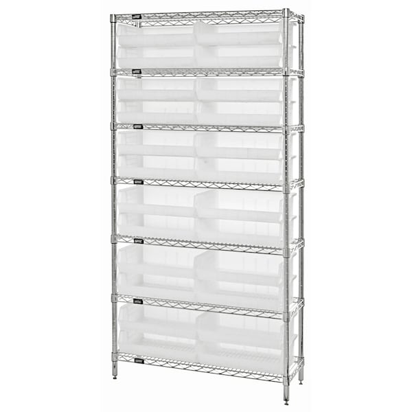 Shelving Unit, Bin Style Hopper, 5 x 16 1/2 x 10 7/8 in Bin HxWxD, Bin Height 5 in, Bin Front Type Open, Bin Depth 10 7/8 in, Bin Color Clear, Frame Material Carbon Steel, Frame Color Chrome, Chrome, Includes Bins Yes, Bin Width 16 1/2 in, Includes (28) QUS239 Bins, (7) Shelves, Load Capacity per Shelf 800 lb, Mobility Mobile, Number of Bins 24, Number of Shelves 7, Number of Usable Sides 1, Overall Depth 12 in, Overall Height 74 in, Overall Width 36 in, Chrome Shelf Finish, N