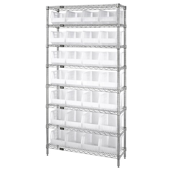 Shelving Unit, Bin Style Giant Hopper, 7 x 8 1/4 x 10 3/4 in Bin HxWxD, Bin Height 7 in, Bin Front Type Open, Bin Depth 10 3/4 in, Bin Color Clear, Frame Material Carbon Steel, Frame Color Chrome, Chrome, Includes Bins Yes, Bin Width 8 1/4 in, Includes (28) QUS239 Bins, (4) Posts, (8) Shelves, Load Capacity per Shelf 800 lb, Mobility Mobile, Number of Bins 28, Number of Shelves 8, Number of Usable Sides 1, Overall Depth 12 in, Overall Height 74 in, Overall Width 36 in, Chrome Shelf Finish, N