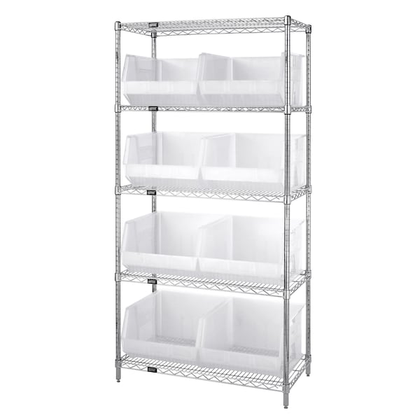 Shelving Unit, Bin Style Giant Hopper, 11 x 16 1/2 x 18 in Bin HxWxD, Bin Height 11 in, Bin Front Type Open, Bin Depth 18 in, Bin Color Clear, Frame Material Carbon Steel, Frame Color Chrome, Chrome, Includes Bins Yes, Bin Width 16 1/2 in, Includes (5) Shelves, (8) QUS270 Bins, Load Capacity per Shelf 800 lb, Number of Bins 8, Number of Shelves 5, Number of Usable Sides 1, Overall Depth 18 in, Overall Height 74 in, Overall Width 36 in, Chrome Shelf Finish, N, Whole Unit Load Capacity 800 lb
