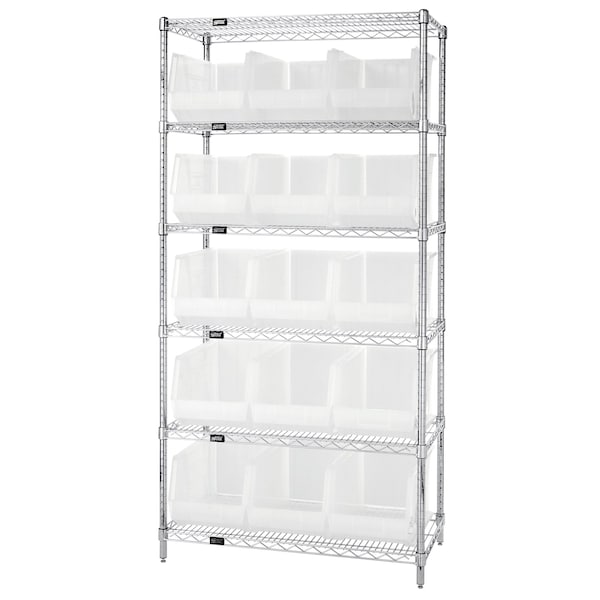 Shelving Unit, Bin Style Hopper, 10 x 11 x 18 in Bin HxWxD, Bin Height 10 in, Bin Front Type Open, Bin Depth 18 in, Bin Color Clear, Frame Material Carbon Steel, Frame Color Chrome, Chrome, Includes Bins Yes, Bin Width 11 in, Includes (15) QUS260 Open Hopper Front Bins, Load Capacity per Shelf 800 lb, Number of Bins 15, Number of Shelves 6, Number of Usable Sides 1, Overall Depth 18 in, Overall Height 74 in, Overall Width 36 in, Chrome Shelf Finish, N, Whole Unit Load Capacity 800 lb