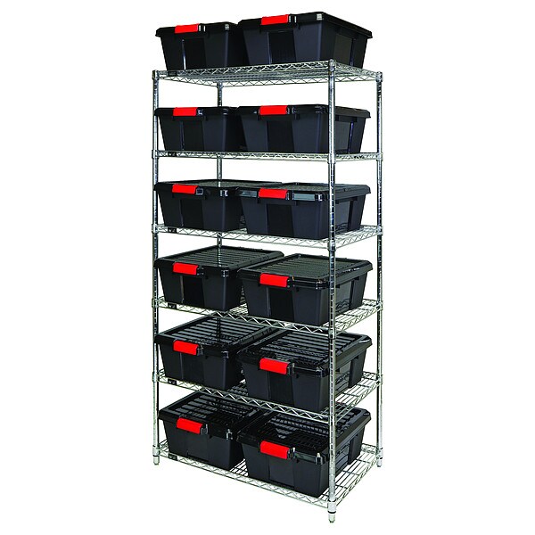 Shelving Unit, Bin Style Safely and Securely Stack, Bin Material Polypropylene, 7 3/4 x 21 x 15 7/8 in Bin HxWxD, Bin Height 7 3/4 in, Bin Depth 15 7/8 in, Bin Color Black, Frame Material Carbon Steel, Frame Color Chrome, Includes Bins Yes, Bin Width 21 in, Includes (12) Latch Containers, (12) Lids, Load Capacity per Shelf 200 lb, Mobility Mobile, Number of Bins 12, Number of Shelves 6, Number of Usable Sides 1, Overall Depth 21 in, Overall Height 74 in, Overall Width 36 in, N