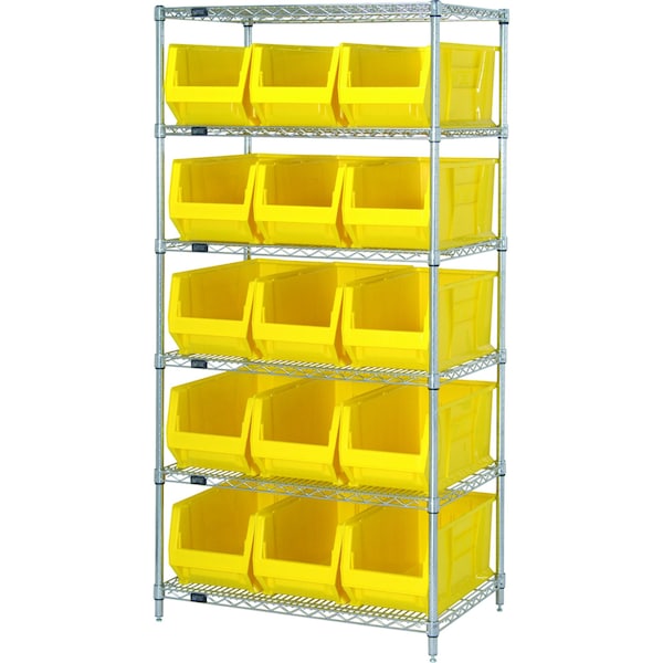 Shelving Unit, Bin Style Shelf, 10 x 11 x 23 7/8 in Bin HxWxD, Bin Height 10 in, Bin Depth 23 7/8 in, Bin Color Yellow, Frame Material Carbon Steel, Frame Color Chrome, Chrome, Includes Bins Yes, Bin Width 11 in, Includes QUS953 Extra-Large Bins, Load Capacity per Shelf 800 lb, Number of Bins 15, Number of Shelves 6, Number of Usable Sides 1, Overall Depth 24 in, Overall Height 74 in, Overall Width 36 in, Chrome Shelf Finish, N, Whole Unit Load Capacity 800 lb