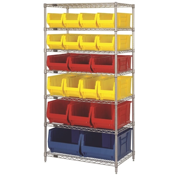 Shelving Unit, (2) 11 x 16 1/2 x 23 7/8 in, (3) 10 x 11 x 23 7/8 in, (3) 7 x 11 x 23 7/8 in, (4) 9 x 8 1/4 x 23 7/8 in, (8) 7 x 8 1/4 x 23 7/8 in Bin HxWxD, Bin Height 7 in, 9 in, 10 in, 11 in, Bin Depth 23 7/8 in, Bin Color Multicolor, Frame Material Carbon Steel, Frame Color Chrome, Bin Width 8 1/4 in, 11 in, 16 1/2 in, Load Capacity per Shelf 200 lb, Number of Bins 20, Number of Shelves 7, Number of Usable Sides 1, Overall Depth 24 in, Overall Height 74 in, Overall Width 36 in, N