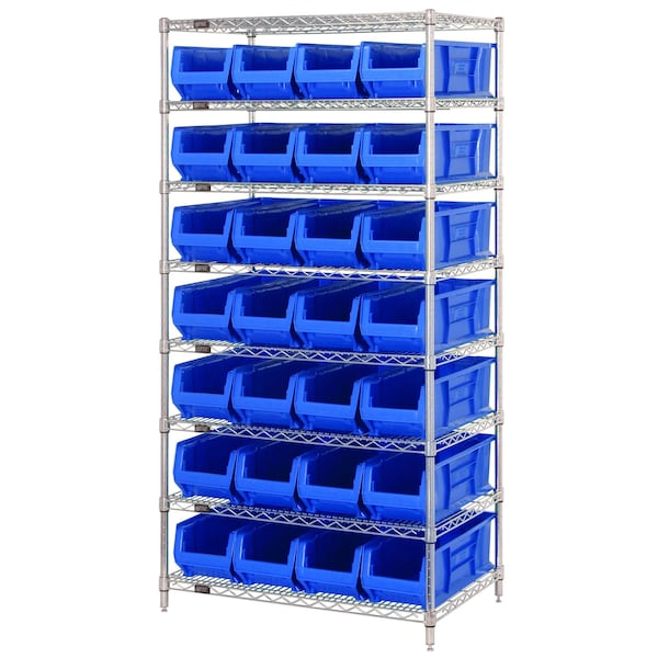 Shelving Unit, Bin Style Shelf, 7 x 8 1/4 x 23 7/8 in Bin HxWxD, Bin Height 7 in, Bin Depth 23 7/8 in, Bin Color Blue, Frame Material Carbon Steel, Frame Color Chrome, Chrome, Includes Bins Yes, Bin Width 8 1/4 in, Includes (28) QUS950 Bins, (8) Shelves, Load Capacity per Shelf 800 lb, Number of Bins 28, Number of Shelves 8, Number of Usable Sides 1, Overall Depth 24 in, Overall Height 74 in, Overall Width 36 in, Chrome Shelf Finish, N, Whole Unit Load Capacity 800 lb