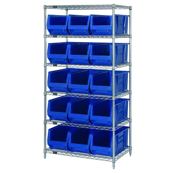 Shelving Unit, 10 x 11 x 29 7/8 in Bin HxWxD, Bin Height 10 in, Bin Depth 29 7/8 in, Bin Color Blue, Frame Material Carbon Steel, Frame Color Chrome, Bin Width 11 in, Load Capacity per Shelf 200 lb, Number of Bins 15, Number of Shelves 6, Number of Usable Sides 1, Overall Depth 30 in, Overall Height 74 in, Overall Width 36 in, N, Whole Unit Load Capacity 800 lb