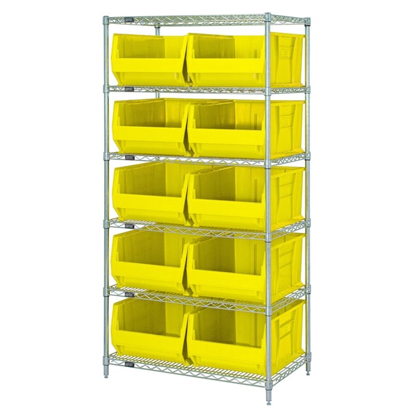 Shelving Unit, Bin Style Shelf, 11 x 16 1/2 x 29 7/8 in Bin HxWxD, Bin Height 11 in, Bin Depth 29 7/8 in, Bin Color Yellow, Frame Material Carbon Steel, Frame Color Chrome, Chrome, Includes Bins Yes, Bin Width 16 1/2 in, Includes (10) QUS974 Bins, (6) Shelves, Load Capacity per Shelf 600 lb, Number of Bins 10, Number of Shelves 6, Number of Usable Sides 1, Overall Depth 30 in, Overall Height 74 in, Overall Width 36 in, Chrome Shelf Finish, N, Whole Unit Load Capacity 800 lb