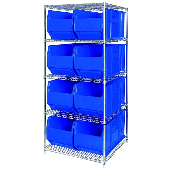 Shelving Unit, Bin Style Shelf, 17 1/2 x 16 1/2 x 35 7/8 in Bin HxWxD, Bin Height 17 1/2 in, Bin Depth 35 7/8 in, Bin Color Blue, Frame Material Carbon Steel, Frame Color Chrome, Chrome, Includes Bins Yes, Bin Width 16 1/2 in, Includes (5) Shelves, (8) QUS993 Bins, Load Capacity per Shelf 600 lb, Number of Bins 8, Number of Shelves 5, Number of Usable Sides 1, Overall Depth 36 in, Overall Height 86 in, Overall Width 36 in, Chrome Shelf Finish, N, Whole Unit Load Capacity 800 lb