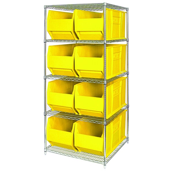 Shelving Unit, Bin Style Shelf, 17 1/2 x 16 1/2 x 35 7/8 in Bin HxWxD, Bin Height 17 1/2 in, Bin Depth 35 7/8 in, Bin Color Yellow, Frame Material Carbon Steel, Frame Color Chrome, Chrome, Includes Bins Yes, Bin Width 16 1/2 in, Includes (5) Shelves, (8) QUS993 Bins, Load Capacity per Shelf 600 lb, Number of Bins 8, Number of Shelves 5, Number of Usable Sides 1, Overall Depth 36 in, Overall Height 86 in, Overall Width 36 in, Chrome Shelf Finish, N, Whole Unit Load Capacity 800 lb