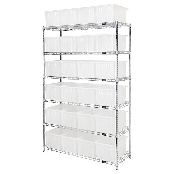 Shelving Unit, Bin Style Stack and Nest, 9 x 11 x 18 in Bin HxWxD, Bin Height 9 in, Bin Depth 18 in, Bin Color Clear, Frame Material Carbon Steel, Frame Color Chrome, Chrome, Includes Bins Yes, Bin Width 11 in, Includes (24) SNT185 Clear Containers, (6) Shelves, Load Capacity per Shelf 800 lb, Number of Bins 24, Number of Shelves 6, Number of Usable Sides 1, Overall Depth 18 in, Overall Height 74 in, Overall Width 48 in, Chrome Shelf Finish, N, Heavy Duty Duty Rating, Assembled Assembled
