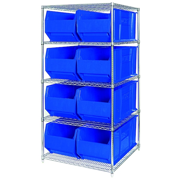 Shelving Unit, Bin Style Shelf, 17 1/2 x 23 7/8 x 35 7/8 in Bin HxWxD, Bin Height 17 1/2 in, Bin Depth 35 7/8 in, Bin Color Blue, Frame Material Carbon Steel, Frame Color Chrome, Chrome, Includes Bins Yes, Bin Width 23 7/8 in, Includes (5) Shelves, (8) QUS997 Bins, Load Capacity per Shelf 600 lb, Number of Bins 8, Number of Shelves 5, Number of Usable Sides 1, Overall Depth 36 in, Overall Height 86 in, Overall Width 48 in, Chrome Shelf Finish, N, Whole Unit Load Capacity 0 lb