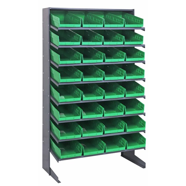 Pick Rack, slopped, single sided, 18''D x 36''W x 60''H, 400 lbs. capacity, includes: 8 shelves and 32 QSB108 green bins, steel