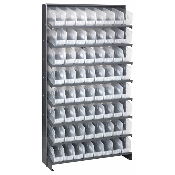 Pick Rack, slopped, single sided, 12''D x 36''W x 63-1/2''H, 400 lbs. capacity, includes: 8 shelves and 64 QSB201 clear bins, steel