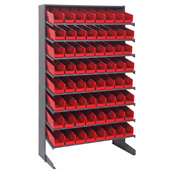 Pick Rack, slopped, single sided, 18''D x 36''W x 60''H, 400 lbs. capacity, includes: 8 shelves and 64 QSB103 red bins, steel