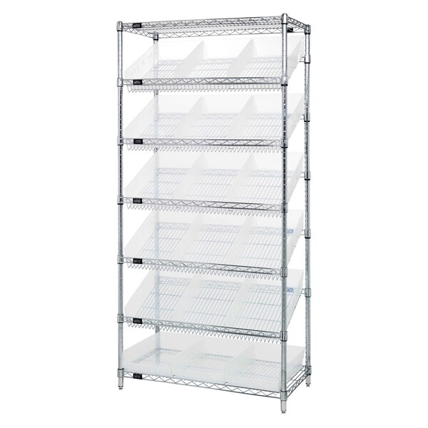 Bin Systems Unit, stationary, 36''W x 18''D x 74''H, includes: 2 flat wire shelves, 5 slanted wire shelves, 4 posts, and 18 17-7/8''W x 11-1/8''D x 4''H clear bins QSB110, chrome plated finish, NSF, shipped KD