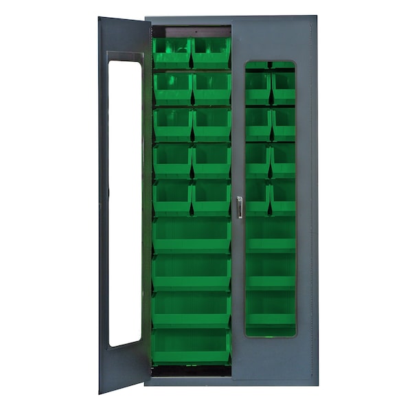 Heavy-Duty 36'' Bin Cabinet, 36''W x 18''D x 78''H, clear acrylic door model, 14 gauge all welded construction, includes: 20 QUS240 and 8 QUS250 green bins, gray powder-coated finish