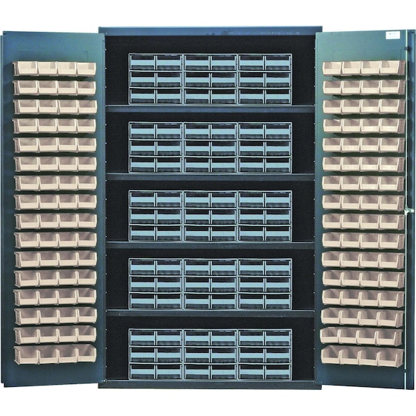 Heavy-Duty 48'' Bin Cabinet, interlocking drawer storage, 48''W x 24''D x 78''H, 400 lb. load capacity per shelf, 14 gauge all welded construction, includes: 4 shelves, 15 QIC-64 gray interlocking drawers and 128 QUS210 ivory bins, gray powder-coated finish