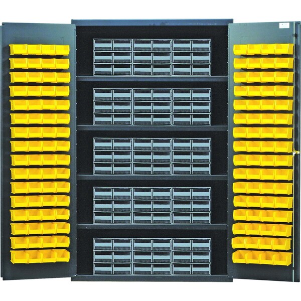 Heavy-Duty 48'' Bin Cabinet, interlocking drawer storage, 48''W x 24''D x 78''H, 400 lb. load capacity per shelf, 14 gauge all welded construction, includes: 4 shelves, 15 QIC-64 gray interlocking drawers and 128 QUS210 yellow bins, gray powder-coated finish