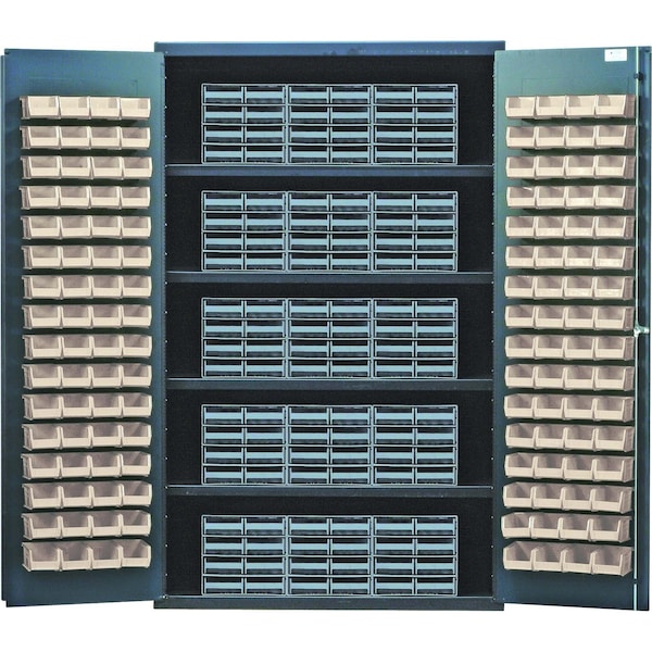 Heavy-Duty 48'' Bin Cabinet, interlocking drawer storage, 48''W x 24''D x 78''H, 400 lb. load capacity per shelf, 14 gauge all welded construction, includes: 4 shelves, 15 QIC-86 gray interlocking drawers and 128 QUS210 ivory bins, gray powder-coated finish