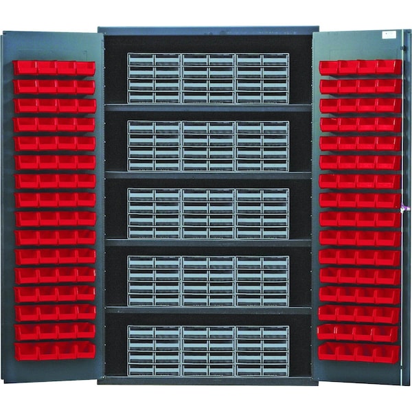 Heavy-Duty 48'' Bin Cabinet, interlocking drawer storage, 48''W x 24''D x 78''H, 400 lb. load capacity per shelf, 14 gauge all welded construction, includes: 4 shelves, 15 QIC-86 gray interlocking drawers and 128 QUS210 red bins, gray powder-coated finish