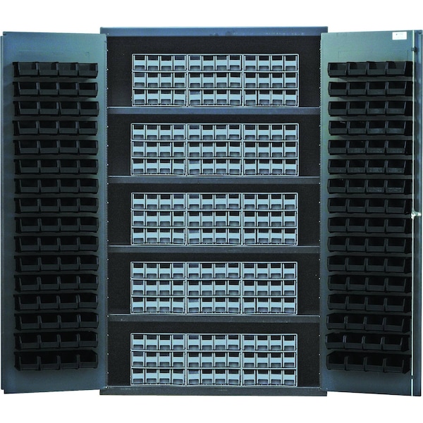 Heavy-Duty 48'' Bin Cabinet, interlocking drawer storage, 48''W x 24''D x 78''H, 400 lb. load capacity per shelf, 14 gauge all welded construction, includes: 4 shelves, 15 QIC-122 gray interlocking drawers and 128 QUS210 black bins, gray powder-coated finish
