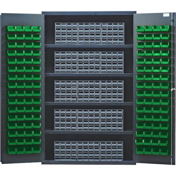 Heavy-Duty 48'' Bin Cabinet, interlocking drawer storage, 48''W x 24''D x 78''H, 400 lb. load capacity per shelf, 14 gauge all welded construction, includes: 4 shelves, 15 QIC-161 gray interlocking drawers and 128 QUS210 green bins, gray powder-coated finish