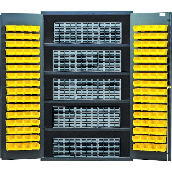 Heavy-Duty 48'' Bin Cabinet, interlocking drawer storage, 48''W x 24''D x 78''H, 400 lb. load capacity per shelf, 14 gauge all welded construction, includes: 4 shelves, 15 QIC-161 gray interlocking drawers and 128 QUS210 yellow bins, gray powder-coated finish