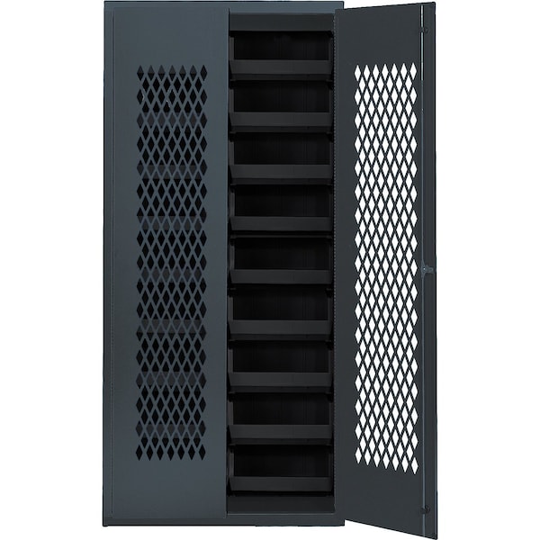 Specialty Bin Cabinets, heavy-duty, mesh door model, 36''W x 18''D x 78''H, Includes: 18 14-3/4''L x 16-1/2''W x 7''H QUS250 black bin, 14-gauge all welded construction, gray finish, ships assembeled