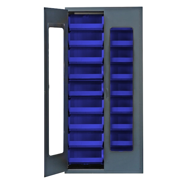 Heavy-Duty 36'' Bin Cabinet, 36''W x 18''D x 78''H, clear acrylic door model, 14 gauge all welded construction, includes: 18 QUS250 blue bins, gray powder-coated finish