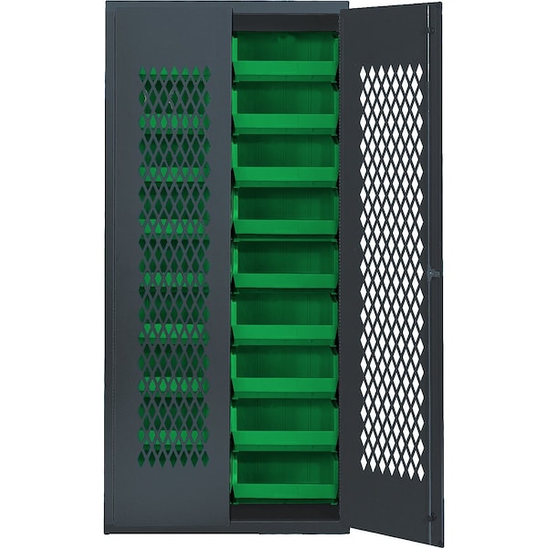 Specialty Bin Cabinets, heavy-duty, mesh door model, 36''W x 18''D x 78''H, Includes: 18 14-3/4''L x 16-1/2''W x 7''H QUS250 green bin, 14-gauge all welded construction, gray finish, ships assembeled