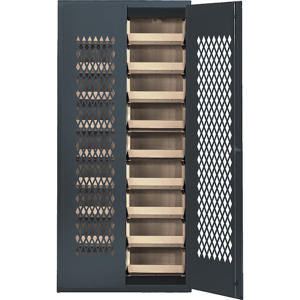 Specialty Bin Cabinets, heavy-duty, mesh door model, 36''W x 18''D x 78''H, Includes: 18 14-3/4''L x 16-1/2''W x 7''H QUS250 ivory bin, 14-gauge all welded construction, gray finish, ships assembeled